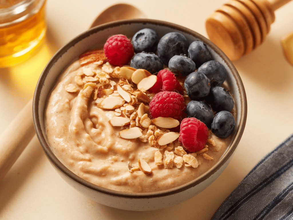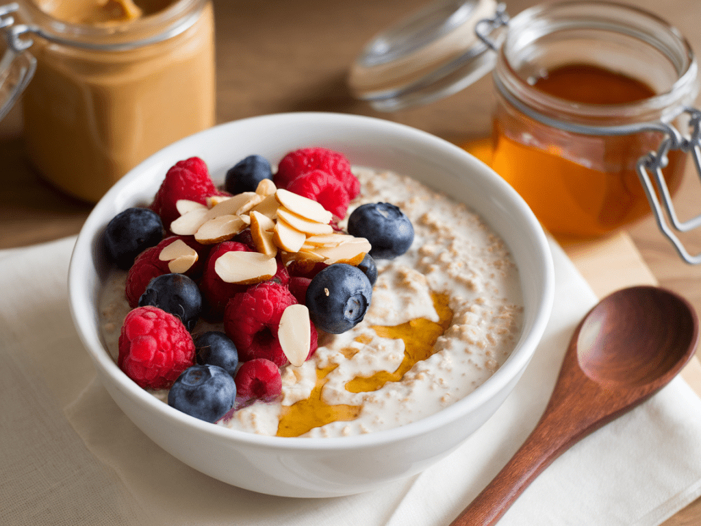 Mix everything in a mason jar, stir, and refrigerate overnight. By morning, you’ll have creamy oats ready to grab and go. Add fresh fruit, nuts, or a spoon of peanut butter before eating.