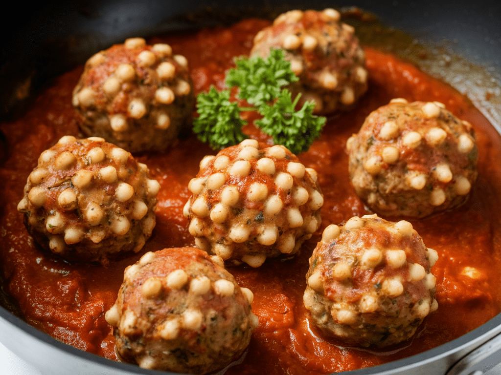 - Tender meatballs with rice quills that thicken the sauce naturally.