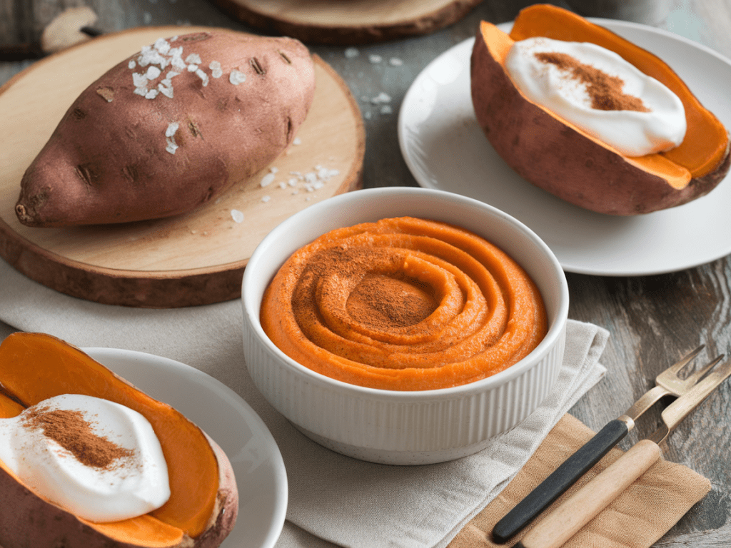 • Add contrast: Sweet potatoes love bold flavors — think lime, chili, or garlic.